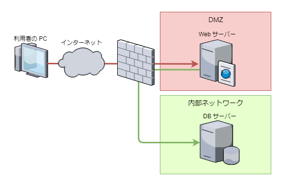 インターネットからアクセスできるのは DMZ 上の Web サーバーのみです(赤い矢印) 。万が一 Web サーバーが乗っ取られても、DMZ から内部ネットワークへのアクセスはファイアウォールを経由しなければならない(緑の矢印)ため、内部ネットワークの安全性を高めることができます。